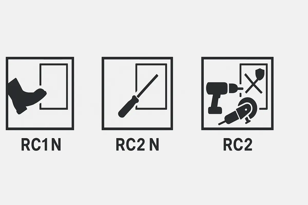| RC2 N | Gelegenheitstäter mit einfachen Werkzeugen wie Schraubendreher, Zange und Keil. | min. 3 Minuten | Guter Schutz gegen Aufhebeln, jedoch ohne geprüftes Sicherheitsglas (das „N“ steht für „normal“). |