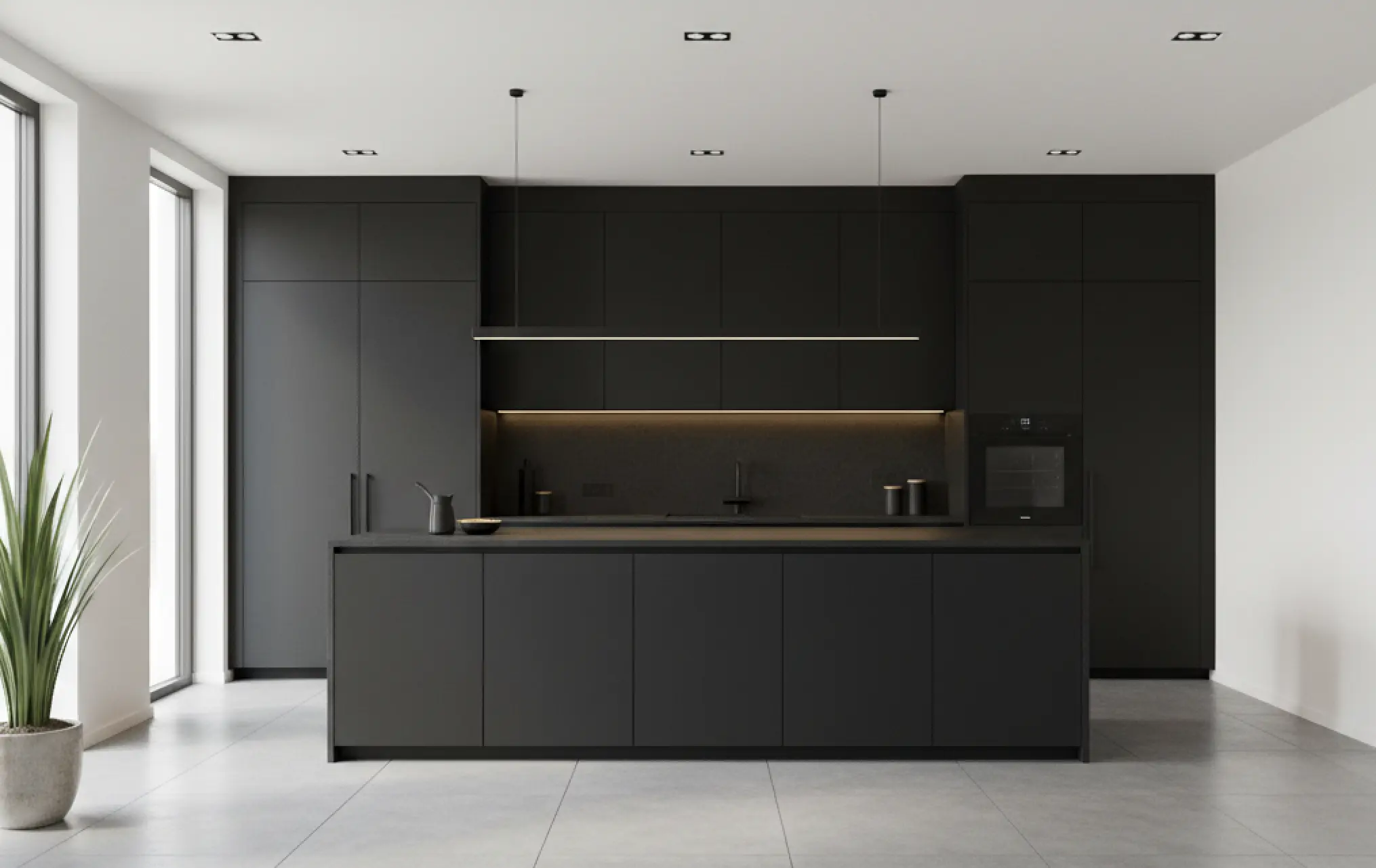 Moderne, matte Küchenfronten als zentrales Designelement einer hochwertigen Küche.