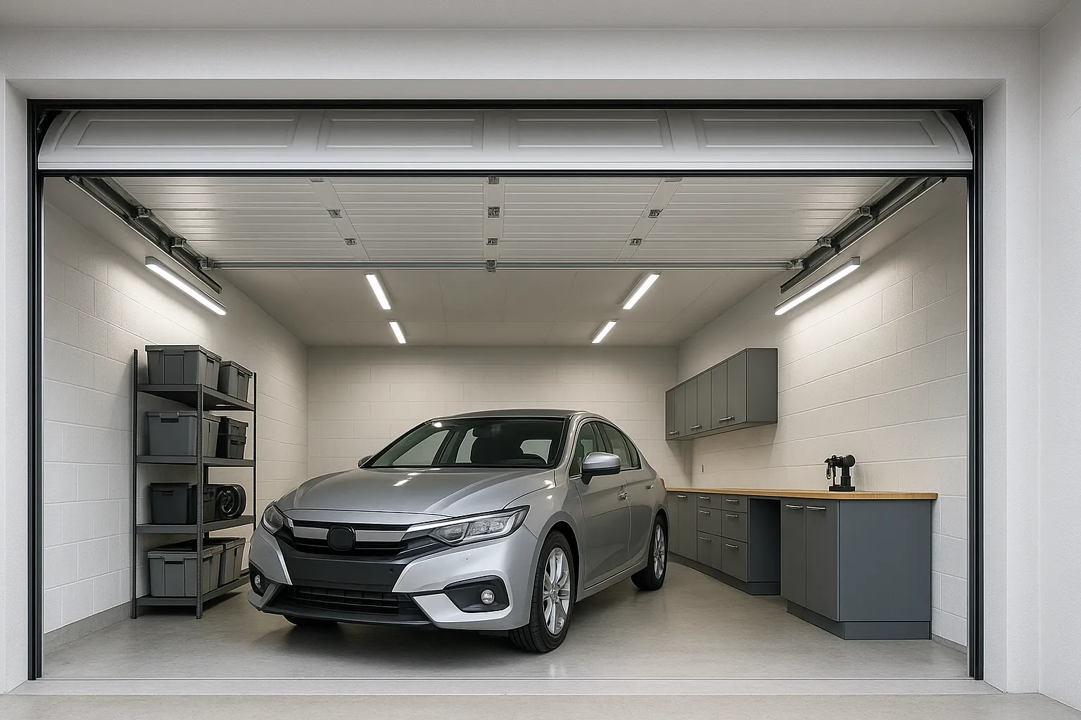 Eine modern und hell beleuchtete Garage mit seitlichen LED-Leuchten, die auch bei offenem Sektionaltor für Helligkeit sorgen.