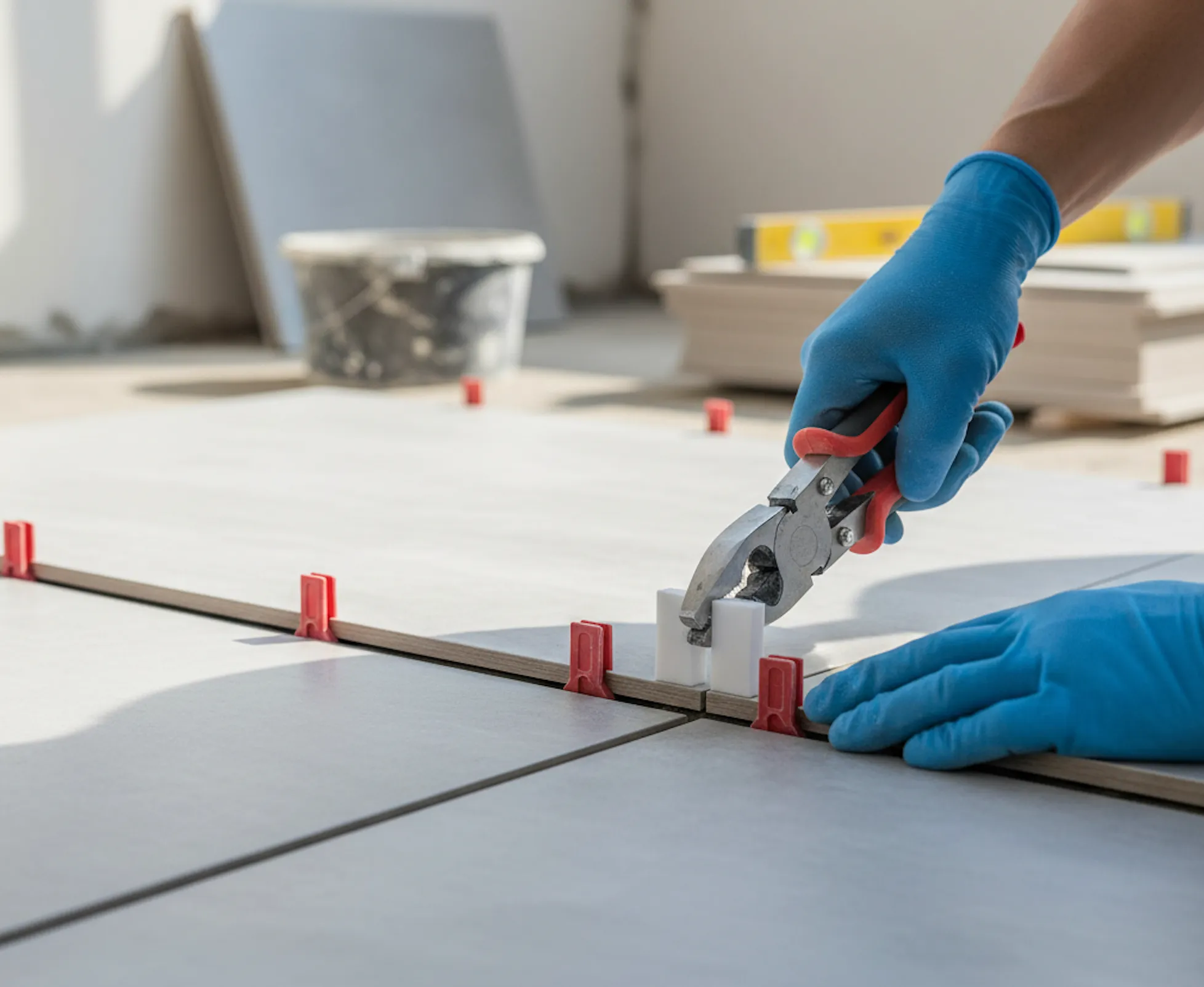 Zug- oder Keilsysteme sind bei der Verlegung von Großformaten unverzichtbar. Sie helfen, die Fliesen während des Aushärtens des Klebers auf exakt gleicher Höhe zu halten und minimieren so Kantenüberstände. Wichtig: Ein Nivelliersystem kann keinen unebenen Untergrund ausgleichen, es perfektioniert nur die finale Oberfläche.