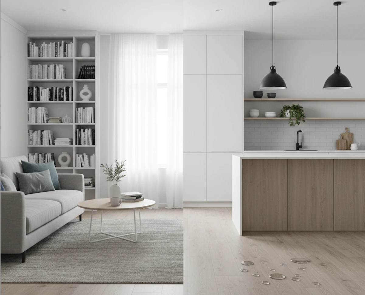 | Wasserbeständigkeit | Standard-Laminat quillt bei Kontakt mit Wasser auf. Nur spezielle „Feuchtraum-Laminat“-Serien sind geeignet. | 100 % wasserfest (gilt für Vollvinyl/SPC-Vinyl). Perfekt für Bad und Küche. |