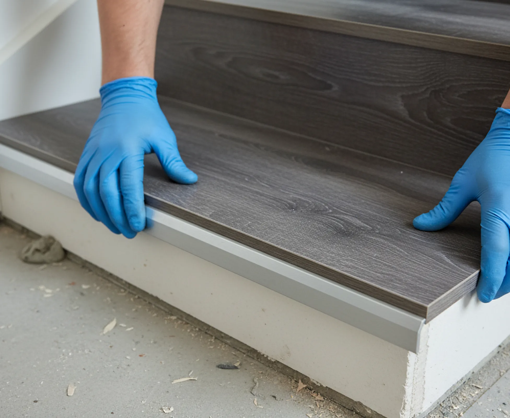 Hierbei handelt es sich um vorgefertigte Renovierungsstufen (meist aus HPL oder Vinyl auf einem HDF-Träger), die eine neue Trittstufe und eine Stufennase in einem Element vereinen. Sie werden passgenau zugeschnitten und auf die alten Stufen geklebt.