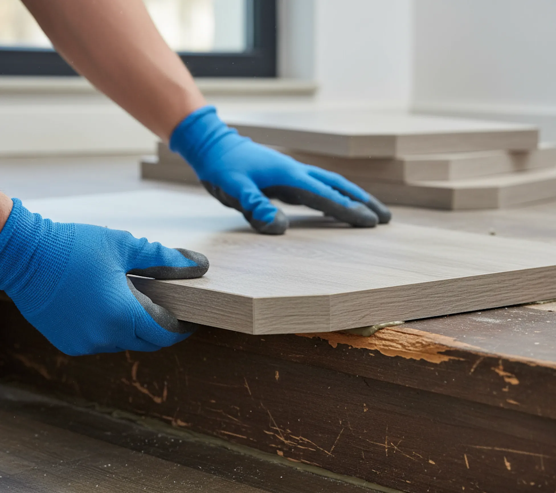- Klebstoff: Zur vollflächigen Verklebung von Vinyl oder HPL auf der Stufe eignen sich hochwertige Montage- oder Parkettklebstoffe (z.B. auf MS-Polymer-Basis).